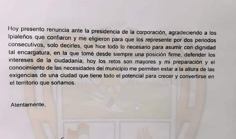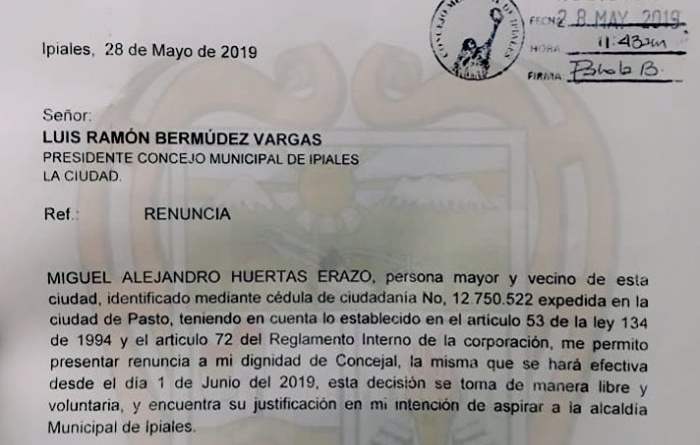 El concejal Miguel Huertas, presentó este martes, la renuncia a su curul en el Concejo de Ipiales, con el fin de aspirar a la alcaldía de este municipio.