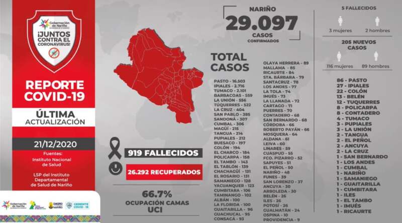 Leer másEl 21 de diciembre de 2020, siendo las 4:00 pm en el Departamento de Nariño se totalizan 29.097 casos positivos