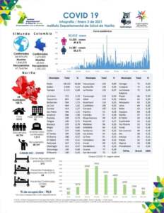 El 03 de enero de 2021, siendo las 4:00 pm en el Departamento de Nariño se totalizan 32.612 casos positivos para Covid-19. Se totalizan 1.014 muertes desde el comienzo de la Pandemia en Nariño.