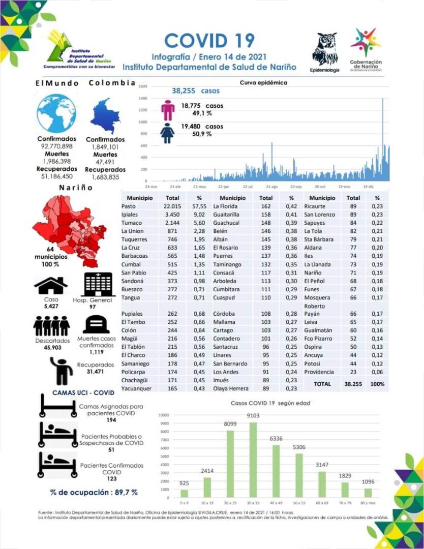 El 14 de enero de 2021, siendo las 4:00 pm en el Departamento de Nariño se totalizan 38.255 casos positivos para Covid-19. Se totalizan 1.119 muertes desde el comienzo de la Pandemia en Nariño.