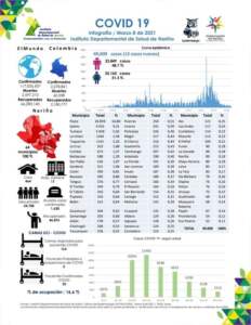 El 8 de marzo de 2021, siendo las 6:00 pm en el Departamento de Nariño se totalizan 49.009 casos positivos para Covid-19. Ocupación de camas UCI en Nariño 16,6%. Se totalizan 1.630 muertes desde el comienzo de la Pandemia en Nariño.
