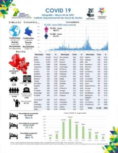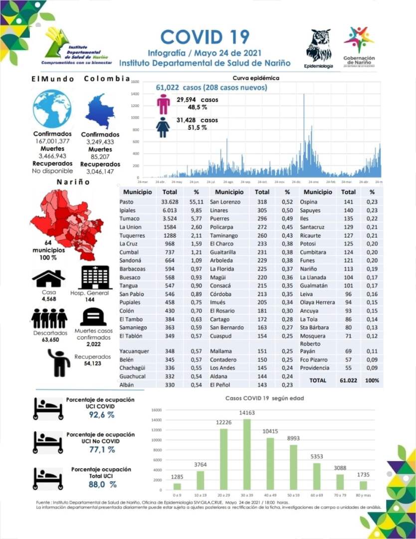 El 24 de mayo de 2021, siendo las 6:00 pm. en el departamento de Nariño se totalizan 61.022 casos positivos para Covid-19. Hoy se reportan 208 nuevos casos positivos (112 mujeres y 96 hombres). Ocupación de camas UCI en Nariño 88,0%. Se totalizan 2.022 muertes desde el comienzo de la Pandemia en Nariño.