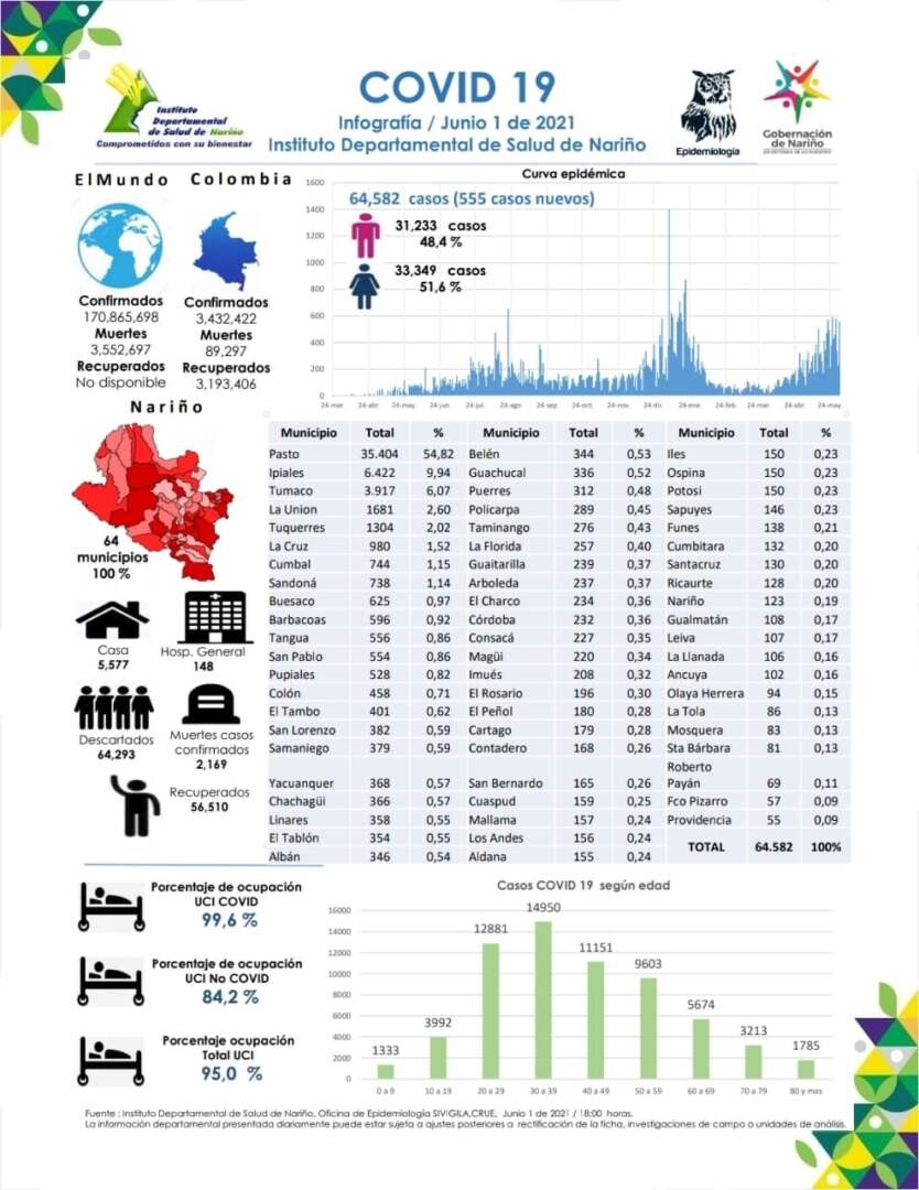 El 01 de junio de 2021, siendo las 6:00 pm. En el departamento de Nariño se totalizan 64.582 casos positivos para Covid-19. Hoy se reportan 555 nuevos casos positivos (287 mujeres y 268 hombres). Ocupación de camas UCI en Nariño 95,0%. Se totalizan 2.169 muertes desde el comienzo de la Pandemia en Nariño.
