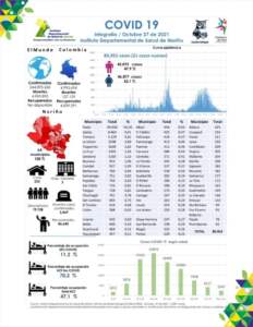 El 27 de octubre de 2021, siendo las 6:00 pm. en el Departamento Nariño se totalizan 89.952 casos positivos Covid-19. Hoy se reportan 21 nuevos casos positivos (10 hombres y 11 mujeres). Ocupación de camas UCI en Nariño 47,1%. Se totalizan 3.069 muertes desde el comienzo de la Pandemia en Nariño.