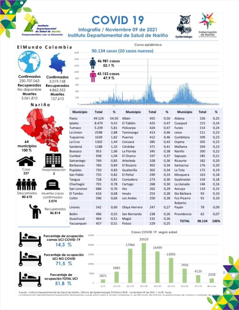 El 09 noviembre de 2021, siendo las 4:00 pm. en el Departamento Nariño se totalizan 90.134 casos positivos Covid-19. Hoy se reportan 20 nuevos casos positivos (7 hombres y 13 mujeres). Ocupación de camas UCI en Nariño 51,8%. Se totalizan 3.074 muertes desde el comienzo de la Pandemia en Nariño.
