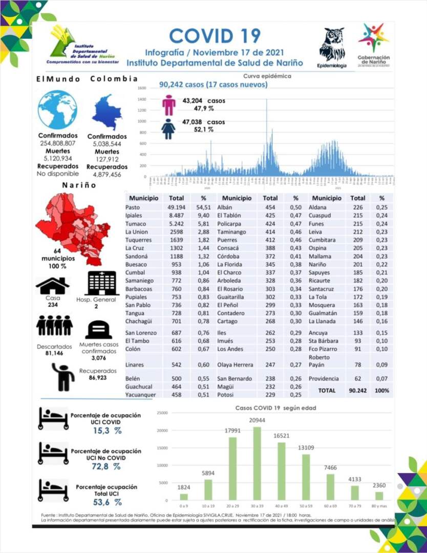 El 17 noviembre de 2021, siendo las 6:00 pm. en el Departamento Nariño se totalizan 90.242 casos positivos Covid-19. Hoy se reportan 17 nuevos casos positivos (10 hombres y 7 mujeres). Ocupación de camas UCI en Nariño 53,6%. Se totalizan 3.076 muertes desde el comienzo de la Pandemia en Nariño.