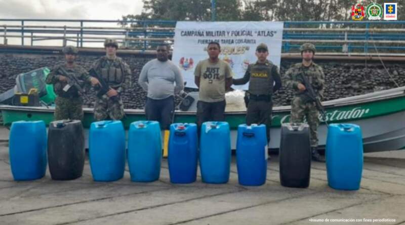 Dos hombres de nacionalidad ecuatoriana, Cristián Andrés Guerrero Téllez y Juan Pablo Moreno Solís, fueron capturados luego de que unidades de la Fuerza de Tarea Hércules y la Policía Nacional interceptaron la lancha en la que se movilizaban por el río Mataje, en jurisdicción de Tumaco, con 327 galones de gasolina.