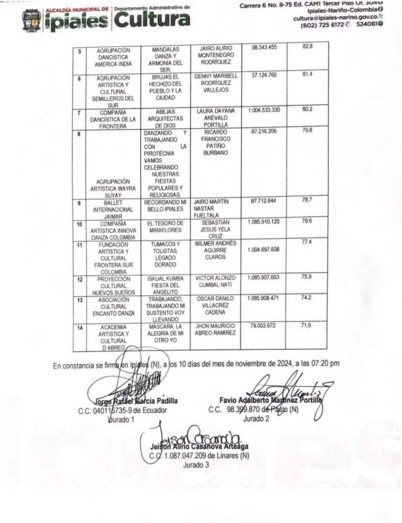 “Han sido jurados en varios eventos artísticos y son profesionales en el tema de la danza, ellos tuvieron en cuenta 60 % la audición, 15 % proyecto, sustentación verbal 15 %, diseño de vestuario 10 %”.
