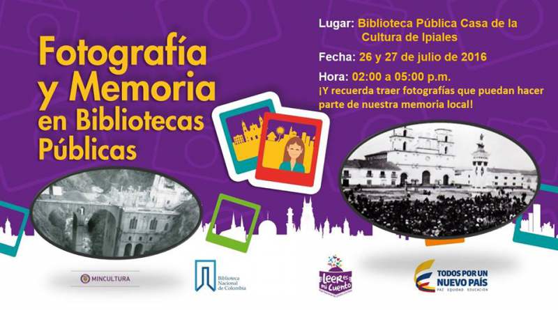 Fotografía y memoria en bibliotecas públicas, vincula los procesos de recuperación de fotografías históricas de los municipios de Colombia. Es así como la biblioteca Pública de Ipiales, inicia con la socialización y divulgación de las memorias locales.