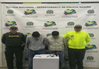 Las labores de patrullaje y control por el sector del barrio Champagnat, permitieron que policiales adscritos a la estación de Ipiales, observan a dos hombres que al notar la presencia de los uniformados toman una actitud sospechosa, al solicitarles un registro voluntario a uno de ellos se encuentra dentro de una mochila de lana un arma de fuego tipo revolver calibre 38, al ver esta situación el sujeto que lo acompañaba emprende la huida a unos metros del lugar fue detenido y al practicarle un registro voluntario se le encontró en la pretina de su pantalón 02 cartuchos calibre 38.