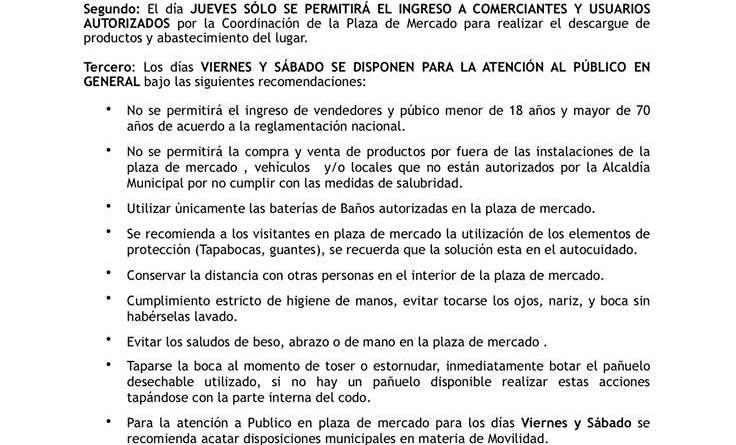 °El personal que vende los productos en la Plaza de Mercado deberán utilizar tapabocas , guantes y aplicación constante de gel antibacterial.