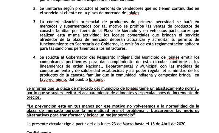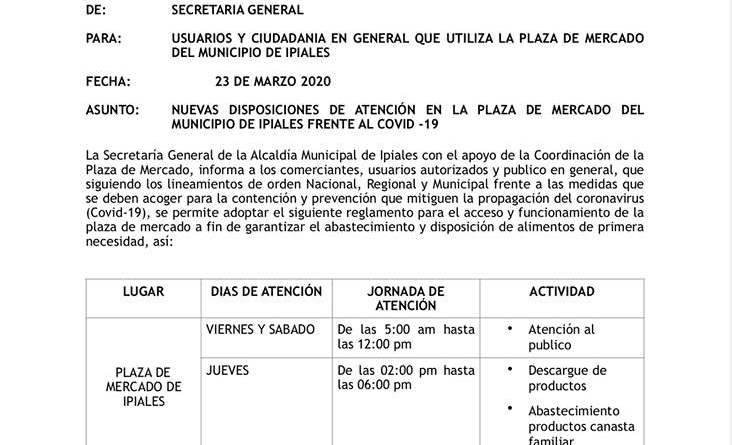 La Alcaldía Municipal de Ipiales, dispuso el mecanismo de funcionamiento de la Plaza de Mercado.