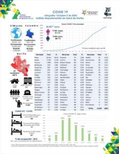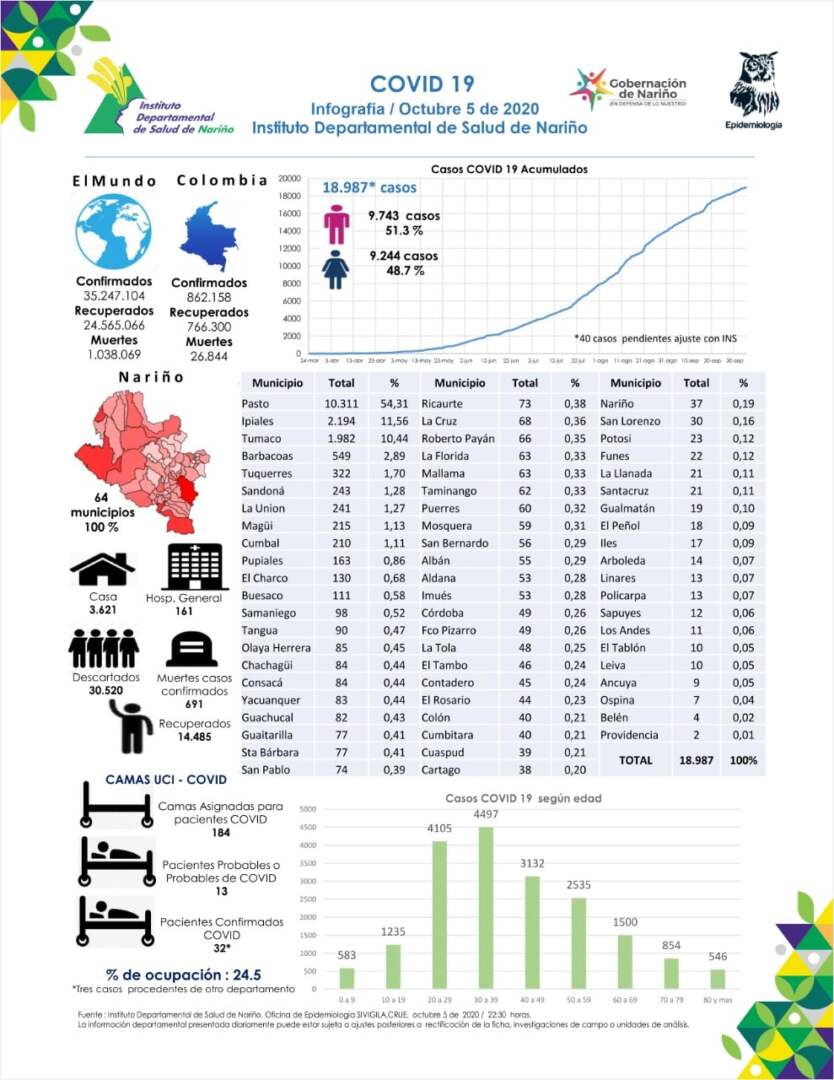 El 5 de octubre de 2020, siendo las 10:30 pm en el Departamento de Nariño se totalizan 18.987 casos positivos para Covid-19. En revisión con el INS *40 casos.