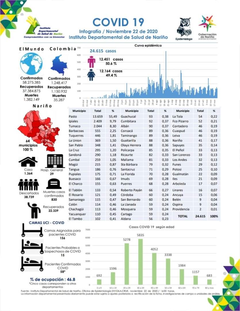 El 22 de noviembre de 2020, siendo las 4:00 pm en el Departamento de Nariño se totalizan 24.615 casos positivos para Covid-19.