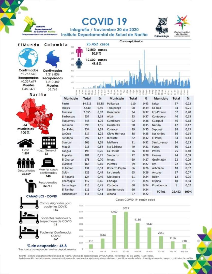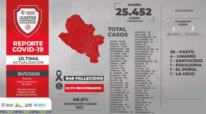 El 30 de noviembre de 2020, siendo las 4:00 pm en el Departamento de Nariño se totalizan 25.452 casos positivos para Covid-19.