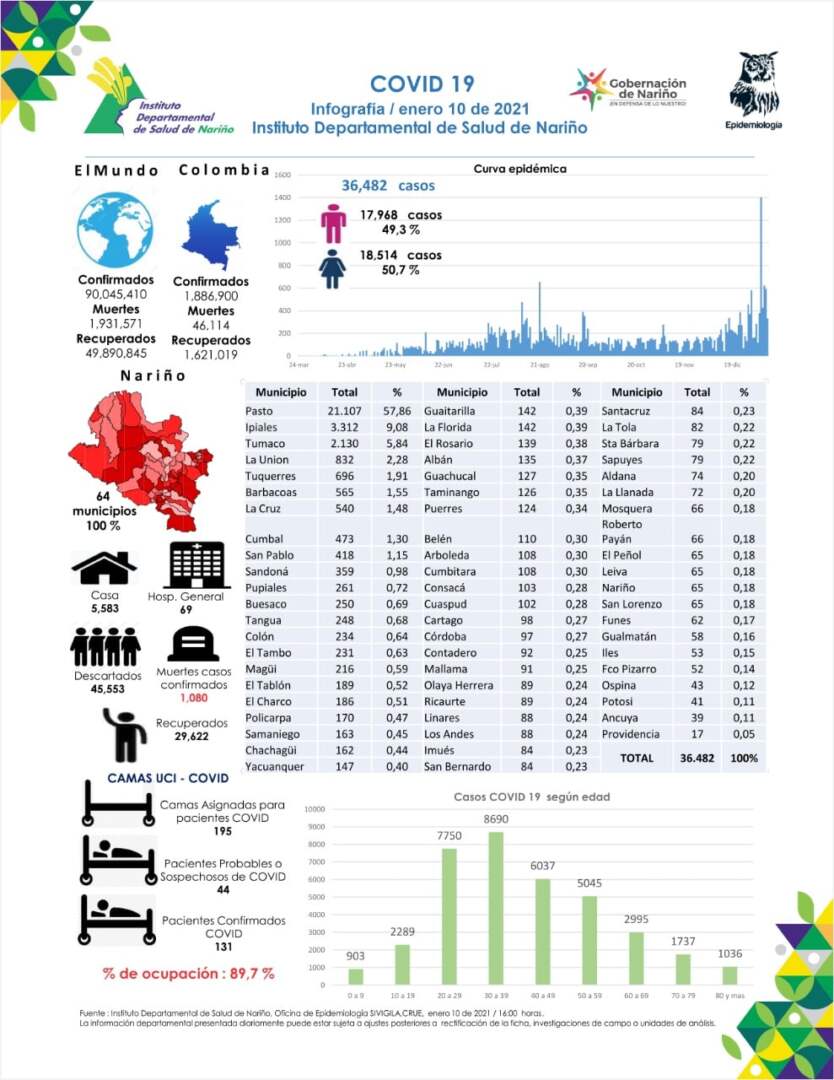 El Instituto Departamental de Salud de Nariño reportó este 11 de enero 326 nuevos casos positivos (156 mujeres y 170 hombres), que corresponden a los municipios de: