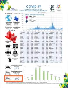 El 27 de abril de 2021, siendo las 6:00 pm en el Departamento de Nariño se totalizan 53.185 casos positivos para Covid-19. Ocupación de camas UCI en Nariño 68,3% Se totalizan 1.787 muertes desde el comienzo de la Pandemia en Nariño.