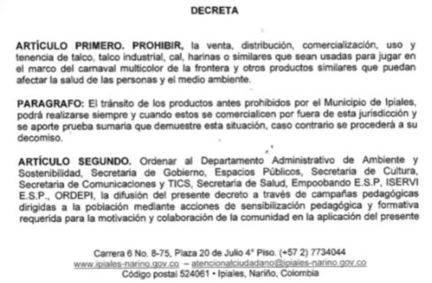 Este miércoles 5 de diciembre, el alcalde de Ipiales, firmó el decreto por medio del cual se prohíbe la venta, distribución, comercialización y tenencia del talcos, talcos industriales, cal, harina o similares, usados para el juego en carnaval multicolor de la frontera.
