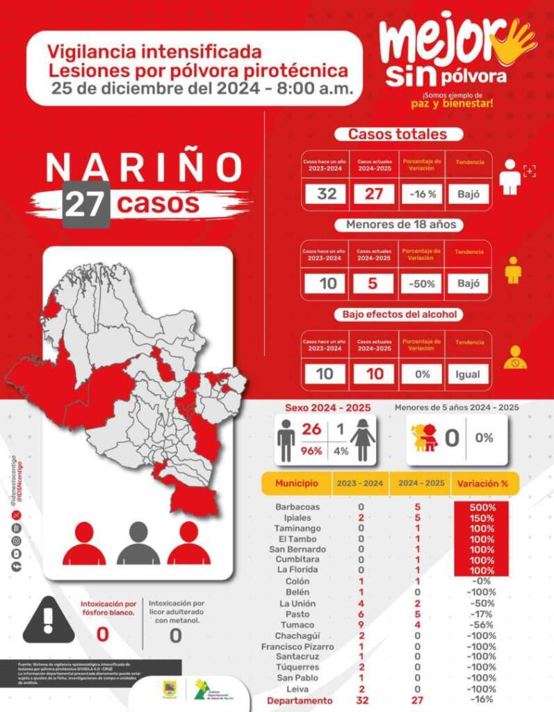 El Instituto Departamental de Salud de Nariño, IDSN, se permite informar que, a través del Sistema de Vigilancia Epidemiológica Intensificada de Lesiones por Pólvora Pirotécnica, en el departamento, a 25 de diciembre de 2024 (corte 8:00 a.m), se tiene un acumulado de 27 personas lesionadas.